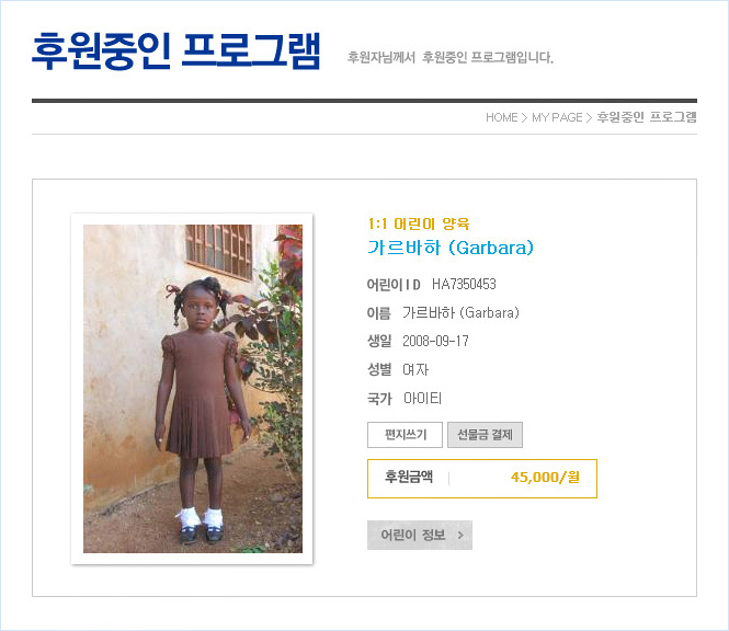 Â÷ÀÎÇ¥, ½Å¾Ö¶ó¾¾°¡ ±¸È£È°µ¿ ¹× ÈÄ¿øÈ°µ¿À» Çϰí ÀÖ´Â ÄÄÆÐ¼ÇÀ» ÅëÇØ 1:1¾çÀ°ºñ ÈÄ¿øÀ» ÁøÇàÇÏ°Ô µÇ¾ú½À´Ï´Ù. ÈÄ¿øÇÁ·Î±×·¥Àº ÈÄ¿ø¾î¸°ÀÌ¿Í 1:1·Î °á¿¬ÇÏ¿© ¼ºÀÎÀÌ µÇ±âÀü±îÁö ¸Å¿ù 4¸¸5õ¿ø¾¿ ¾à 15~20³â°£ Á¤±âÀûÀ¸·Î ÈÄ¿øÀ» ÇϰԵǸç ÈÄ¿ø¾î¸°ÀÌ¿Í ÆíÁöµµ ÁÖ°í¹Þ´Â Çü½ÄÀ¸·Î ÁøÇàÀÌ µË´Ï´Ù.